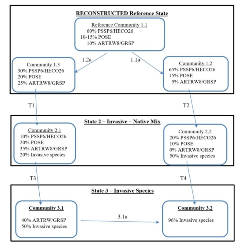 T1 Result: transition from Community 1.3 in the Reference state with no invasive species to Community 2.1 in State 2 which is a mix of invasive and native species. This is a continuation of the decline that started with Pathway 1.2a. In Community 2.1 shrubs, native bunchgrasses and invasive species are co-dominant. Primary Trigger: grazing pressure to bluebunch wheatgrass. A secondary trigger would be a year with high moisture and a micro-flush of cheatgrass and other invasive species Ecological process. Consistent defoliation pressure to bluebunch wheatgrass results in poor vigor, shrinking crowns and some mortality. Most sites in the Reference State have some scattered cheatgrass seed as the seed blows onto most site annually. This seed is waiting for enough moisture to germinate and to compete with the native species for space, light and moisture. When the right year happens even pristine communities in the Reference State are susceptible to colonization by cheatgrass. Indicators: The occurrence of annual grasses on sites where they had been absent. Reduced cover and distance between bluebunch wheatgrass plants. T2 Result: shift from Community 1.2 in Reference State with no invasives species to community 2.2 in State 2 with a mix of native and invasive species. This is a continuation of the decline that started with Pathway 1.1a. This transition occurs when invasive species have colonized the site and are successfully reproducing. Primary Trigger: a repeat of moderate-severity fire. Repeated fire is more common in south Central Washington than elsewhere in MLRA 007X. Ecological Process: fire kills remaining sagebrush and spiny hopsage plants. This second fire is also detrimental to bluebunch wheatgrass plants and the exhibit poor vigor, shrinking crowns and mortality. Primary Trigger: moderate-severity fire happens again.