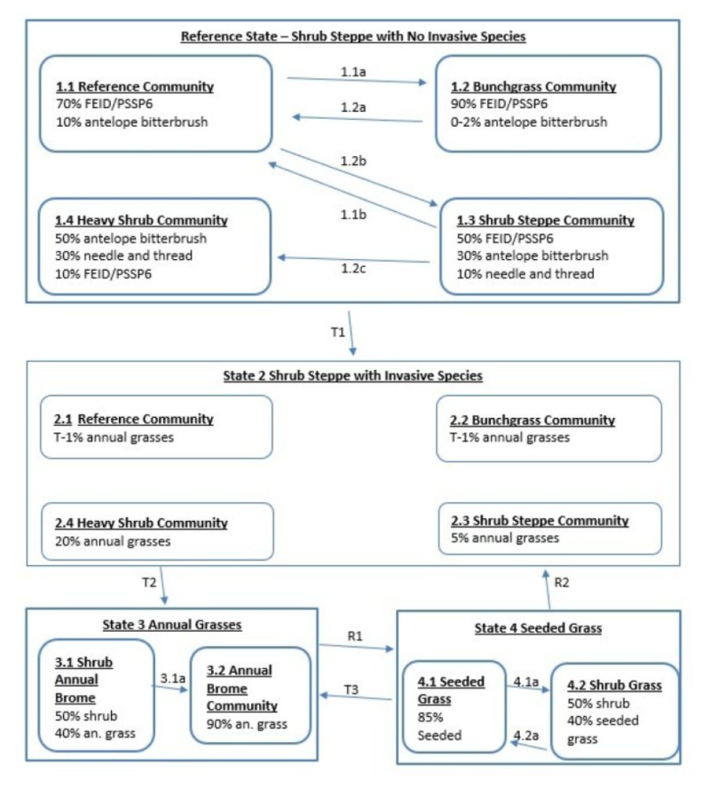 Fire sensitive, bitterbrush dominates the reference state overstory, while perennial bunchgrasses such as Idaho fescue and bluebunch wheatgrass are dominant in the herbaceous understory. The shrub layer is typically waist- to shoulder-height bitterbrush with a mix of other shrub steppe species scattered throughout including Wyoming sagebrush, rabbitbrush, and current.