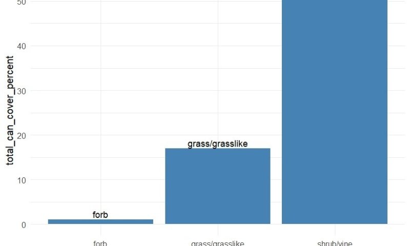 Bare ground is between three and 12 percent, averaging eight percent. This refers to exposed mineral soil not covered by litter, rock, basal cover, plant cover, standing dead, lichen and/or moss. -