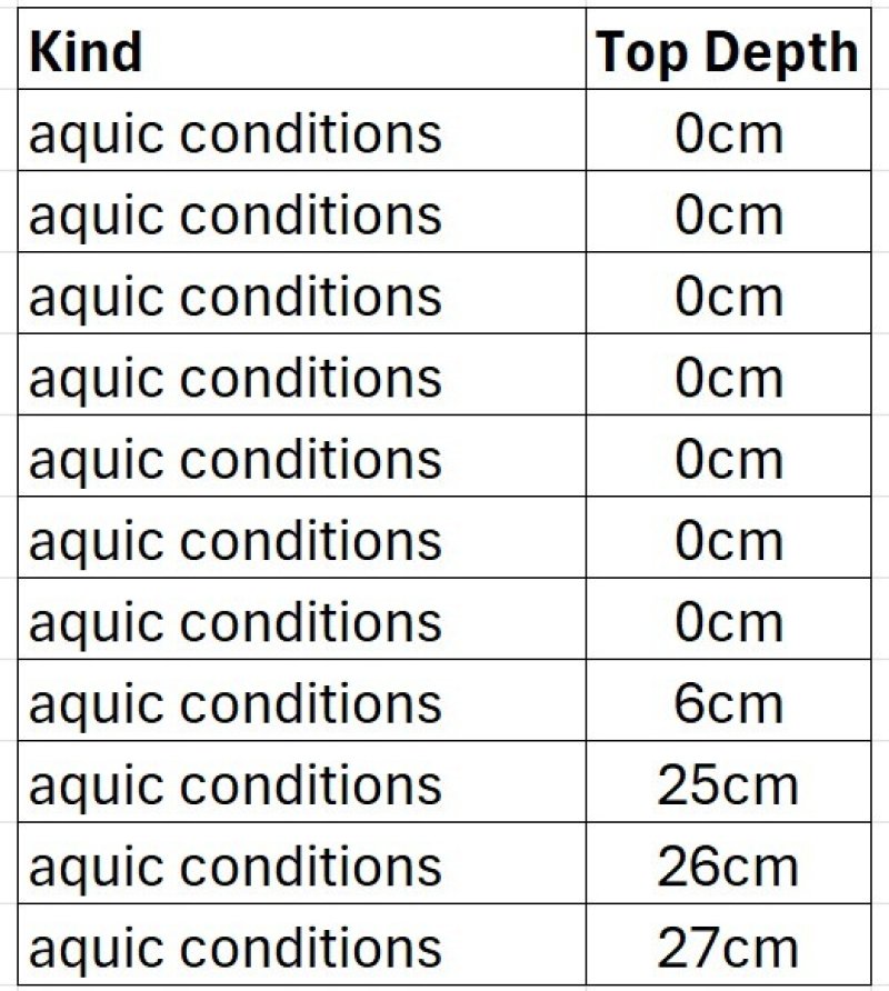 o Have a seasonal water table depth between 0 and 30 centimeters