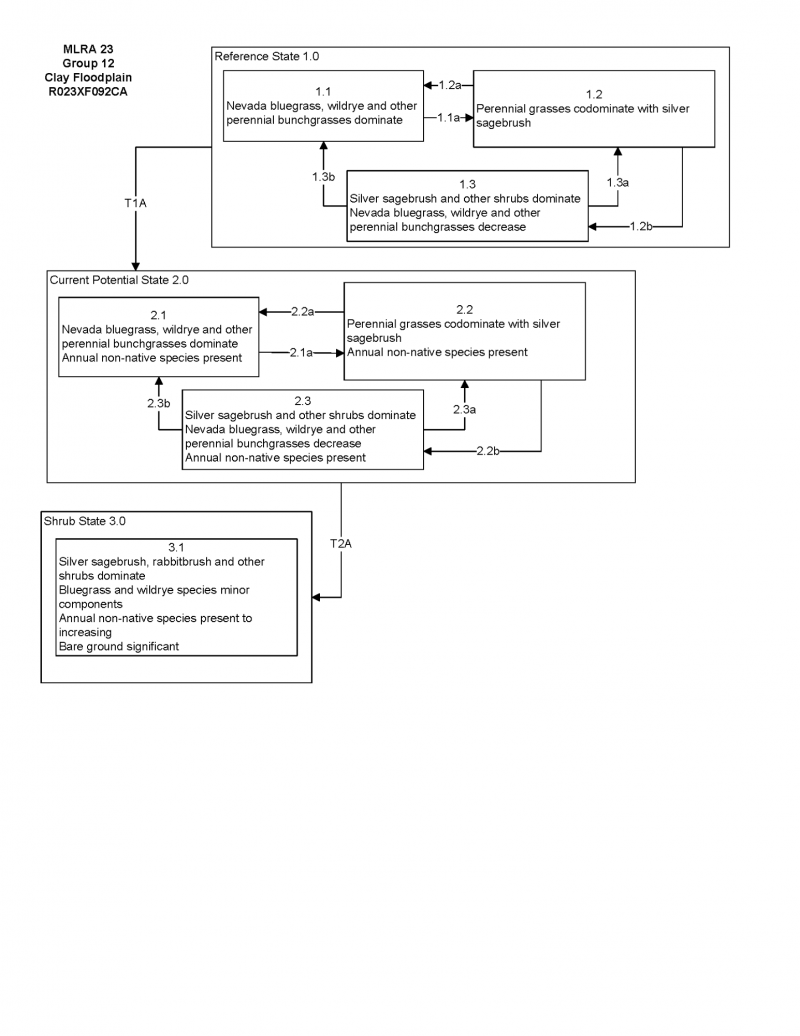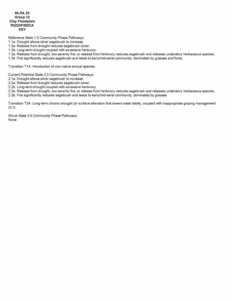 This California ecological site correlates most closely to the Clay Basin (023XY003NV) site in Nevada. It is more productive than the group modal with an average of 1100 lb/ac in normal years. Like the Clay Basin site, the Clay Floodplain may stand alone or may surround the wetter Wet Clay Basin site that is more frequently flooded. This site is also dominated by Nevada bluegrass but can see an increase in silver sagebrush with long-term drought or long-term inappropriate grazing management.