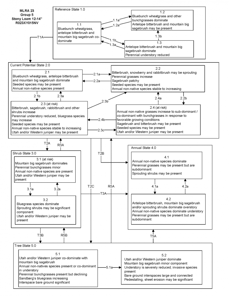 This site is less productive than the modal site with only 900 lbs/ac in normal years. Slopes on this site typically range from 4 to 15 percent. Soils in this site have a loam surface layer modified with high volumes of stones and cobbles. Unlike the group modal site, the dominant shrub on this site is antelope bitterbrush with mountain big sagebrush making up only a small component of the plant community. This site is similar to the modal with a five state model.