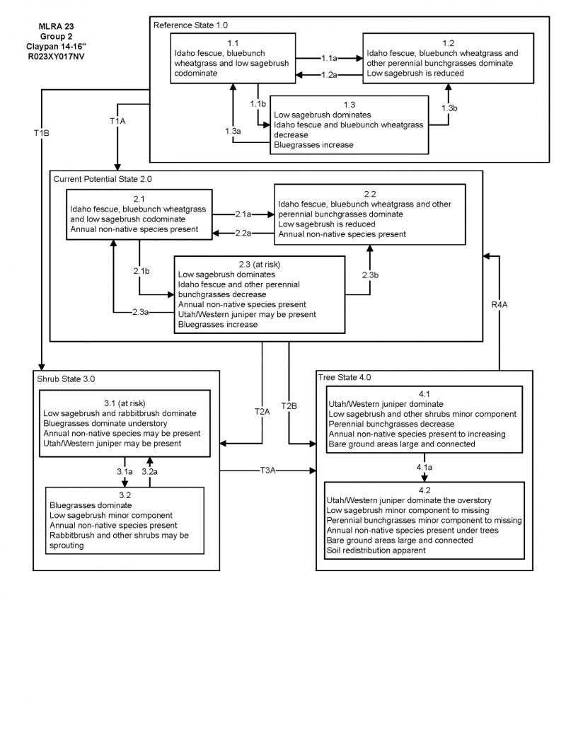 The Claypan 14-16” (023XY017NV) ecological site is the modal site for this group as it has the most acres mapped. This site occurs on summits and sideslopes of mountains and higher elevation plateaus on all aspects. Slopes range from 2 to 30 percent, but slope gradients of 2 to 8 percent are most typical. Elevations are 6500 to 8000 feet. Average annual precipitation is 14 to over 16 inches. These soils normally have a high percentage of gravels and cobbles on the surface which occupy plant growing space yet help to reduce evaporation and conserve soil moisture. Depth to a fine textured subsoil ranges from 5 to 10 inches. The subsoils swell on wetting, and shrink and crack upon drying. Swelling of the subsoil with wetting in the early spring results in poor soil aeration, forming a perched water table near the surface. Infiltration of water is restricted once these soils are saturated and the site is subject to loss of water by runoff. Loss of the surface layer results in decreased productivity of the plant community. The surface layer has a low available water capacity due to its limited thickness. Because of the higher elevations where this site occurs, the soils are cool and plant growth is not initiated until mid- to late spring. Pedestalling of some grass plants is common during the winter due to frost heaving. The dominant plants on this site are low sagebrush, Idaho fescue, and bluebunch wheatgrass. Thurber’s needlegrass may be a significant component along with several perennial forbs. This site’s annual production is 700 lbs/ac in normal years but can range from 500 to 900 lbs/ac.