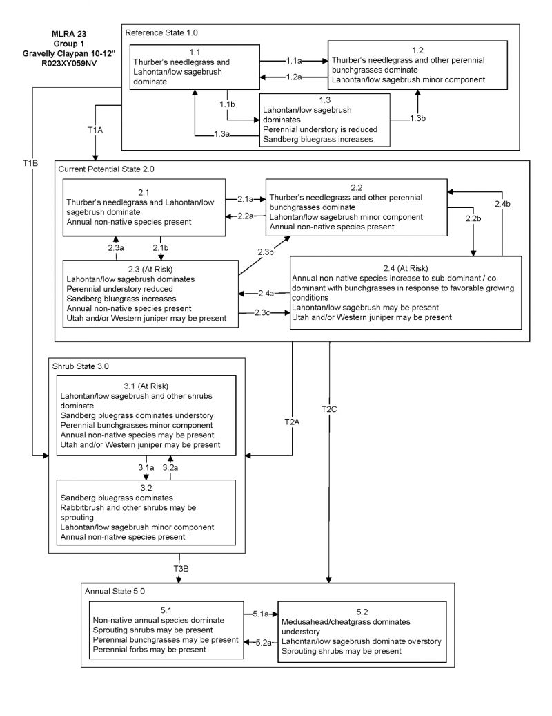 The dominant grasses on this site are Thurber’s and Webber’s needlegrass. Like the modal site, Low sagebrush is the dominant shrub and spiny hopsage (Grayia spinosa) is a subdominant shrub. It is less productive than the modal site with 450 lbs/ac in a normal year. This site is found on convex summits and backslopes of low hills and erosional fan remnants, from 5000 to 6000 feet. The soils on this site have formed in alluvium or residuum derived from volcanic rock sources. These soils are generally shallow or moderately deep. There is a moderate to strong-structured, clay subsoil ranging from 8 to 12 inches in the soil profile. The soils have high amounts of gravel and/or small cobbles (over 65 percent ground cover) on the surface which provide a stabilizing effect on surface erosion conditions. This site has a four state model; it is unlikely to get a tree state or an eroded state. This site has been seen in a shrub state with no non-native annuals, indicating that it can transition from Reference to the Shrub State, Transition T1B: Long-term inappropriate grazing management favors shrubs and the shallow-rooted Sandberg bluegrass.