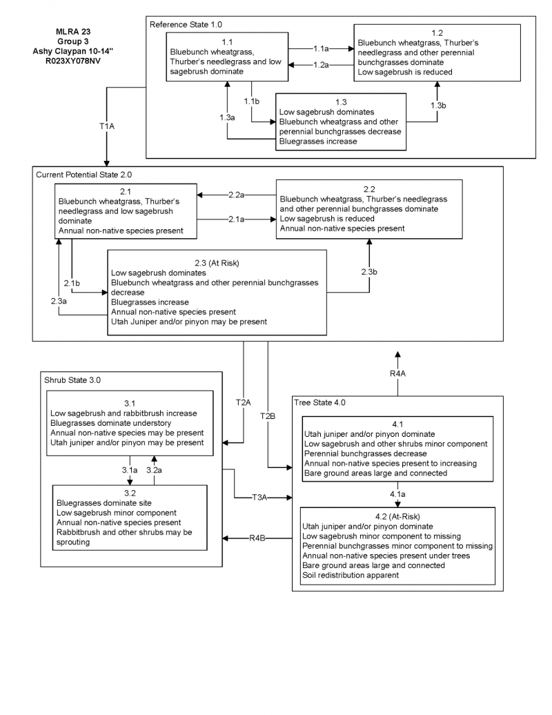 This site is slightly more productive than the modal site, with production ranging from 700 to 1300 lb/ac, 1000 lb/ac in normal years. The dominant grasses are Thurber’s needlegrass and bluebunch wheatgrass. The dominant shrub is still Lahontan and/or low sagebrush, and may have a component of antelope bitterbrush. This site is found at the lower elevation of the group’s range, from 5800-7000 feet. This site has the same model as the modal site with 6 states.