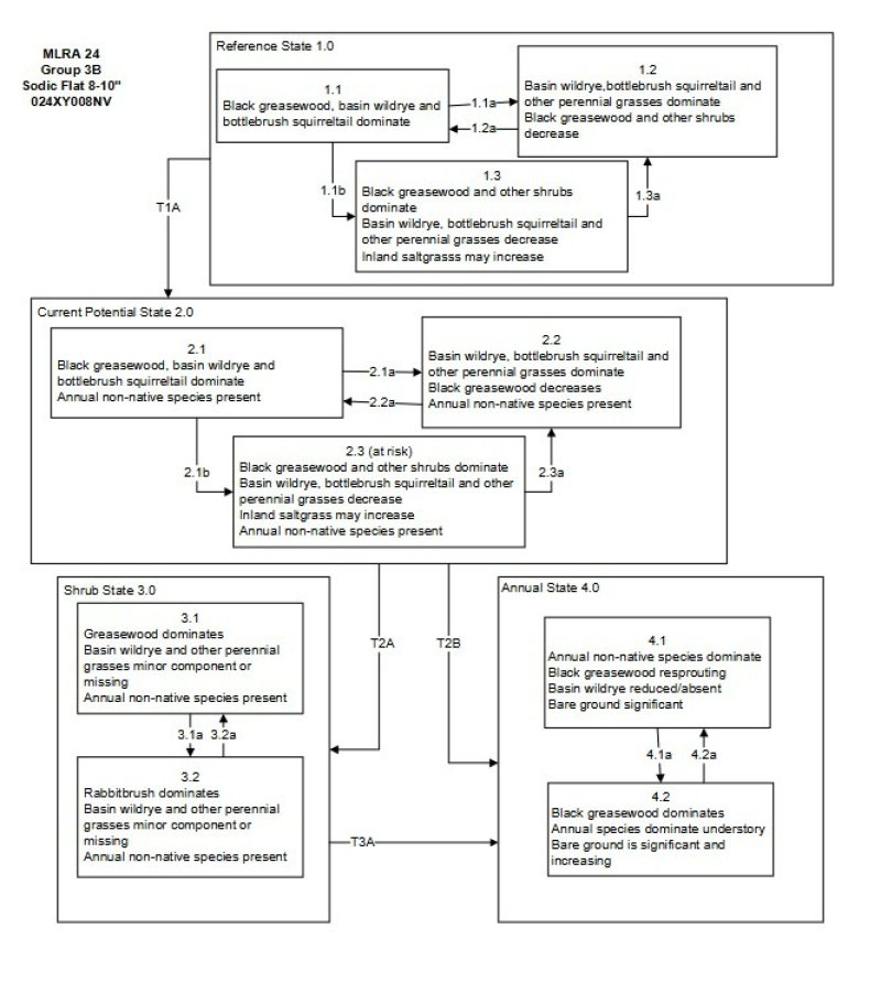 Drought will initially cause a decline in bunchgrasses, but prolonged drought will eventually cause a decline in shrubs, including black greasewood. Marcum and Kopec (1997) observed inland saltgrass more tolerant of increased levels of salinity than alkali sacaton therefore dewatering and/or long term drought causing increased levels of salinity would create environmental conditions more favorable to inland saltgrass over alkali sacaton. Alkali sacaton is considered a facultative wet species in this region; therefore it is not drought tolerant. A lowering of the water table can occur with groundwater pumping and this may contribute to the loss of deep-rooted species such as greasewood and basin wildrye and an increase in rabbitbrush (Ericameria nauseosa) and other species that are not groundwater dependent. Annual non-native species such as halogeton (Halogeton glomeratus) and cheatgrass (Bromus tectorum) invade these sites where competition from perennial species is decreased. Three alternative stable states have been identified for this site.