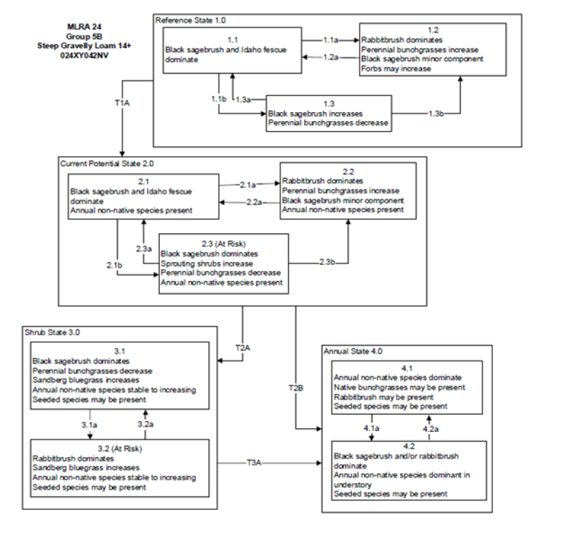 Fire in at-risk community phase (from 2.3) may transition to annual state (4.0), soil disturbing treatments may also transition to an annual state.