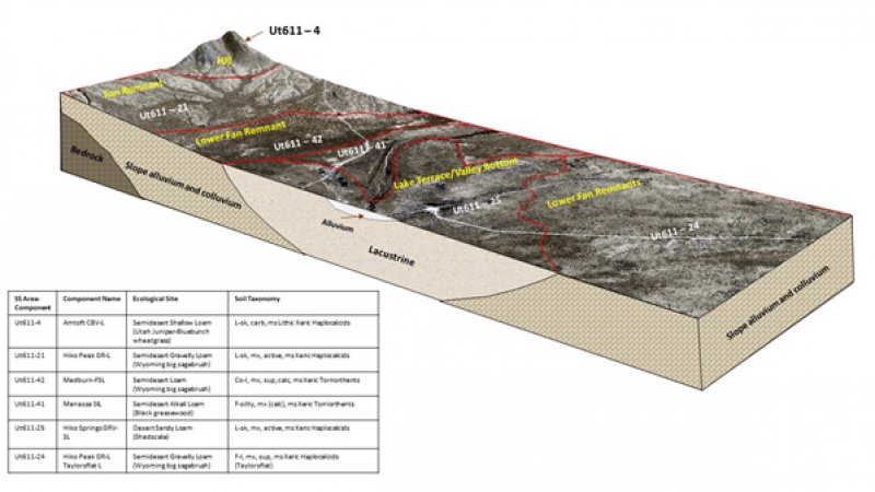 The Semidesert Alkali Loam (Black Greasewood) South site is a broad ecotone between Alkali Flat (Greasewood) 028AY004UT and Semidesert Loam (Wyoming big sagebrush) 028AY220UT that occurs on lake terraces and fan remnants. Greasewood increases as the ecotone nears the Alkali Flat site and Wyoming big sagebrush (Artemisia tridentata ssp. Wyomingensis) increases as it nears Semidesert Loam. There is often an equal mixture of both shrubs in the community.