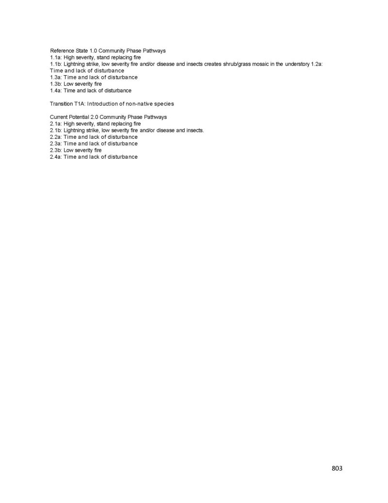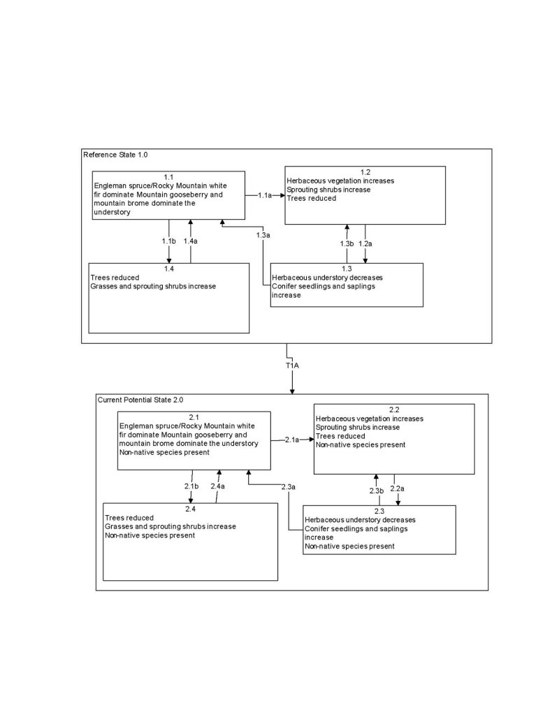 The reference plant community is dominated by Engelmann's spruce. Overstory composition is about 80 to 90 percent Engelmann's spruce, 5 to 10 percent white fir and quaking aspen. Mountain gooseberry, western raspberry and snowberry are important understory shrubs. Columbia needlegrass, pinegrass, mountain brome and slender wheatgrass are the most prevalent understory grasses. Starwort, meadowrue, and erigeron are common understory forbs. An overstory canopy of 40 to 50 percent is assumed to be representative.