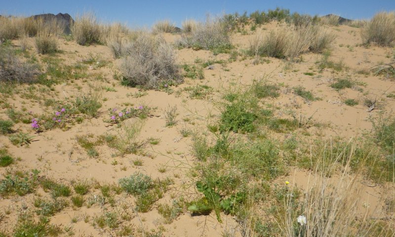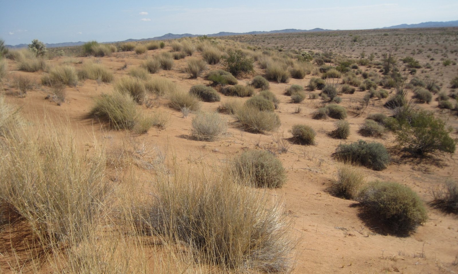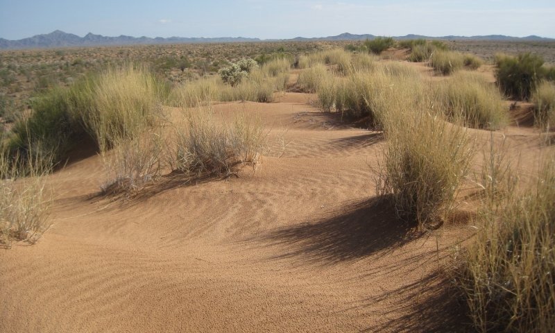 Grassland is a mixed desert plant community on wind-blown fine sands. The reference plant community is highly productive since all rainfall is captured and retained in the soil for long periods. Big galleta, jointfir and burrobush predominate, along with a variety of subshrubs and forbs. Cholla, creosotebush and ocotillo are widely scattered, mostly occurring on more stable summits, shoulders, and leeward side-slopes. Windward areas are unstable, with active windblown sands scouring large areas bare. Spring annuals and spring seasonal perennials (such as desert lily and birdcage evening primrose) flourish with sufficient winter precipitation.