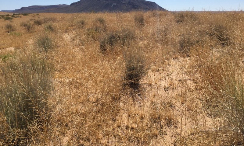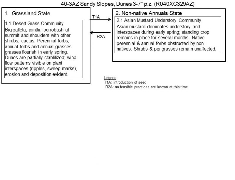 Sandy Slopes, Dunes, 3"-7" p.z., supports a mixed plant community on wind-blown, fine sands. Two ecological states can occur, Grassland and Non-Native Annuals. Both are dominated by big galleta, with scattered shrubs and cactus. Trees are largely absent. Early spring growth of annual and perennial forbs can be highly productive following wet winters. The Non-native Annuals state may be difficult to observe in the field due to the early spring growing period, and Asian mustard, the predominant species, readily breaks up and disperses with wind. Fire is not a typical disturbance, though Non-native Annuals may carry a fire under the right fuel conditions. Lightning is an unlikely ignition source as Asian mustard biomass is typically dispersed prior to the occurrence of summer convective thunderstorms. Current field observations indicate burned areas are confined to roadsides. Plant-soil relationships are excellent. Aspect is desert shrub-grassland.