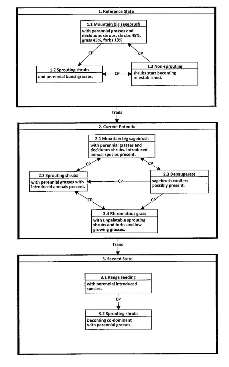The Reference State is a description of this ecological site just prior to Euro-American settlement but long after the arrival of Native Americans. The description of the Reference State was determined by NRCS Soil Survey Type Site Location information and familiarity with rangeland relict areas where they exist. The least modified plant community (1.1) within the Reference State would have been a sagebrush-dominated stand with mountain big sagebrush (Artemisia tridentata spp. vaseyana), mountain snowberry (Symphoricarpos oreophilus) and associated bunch grasses such as bluebunch wheatgrass (Pseudoroegeneria spicata), Nevada bluegrass (Poa secunda) and slender wheatgrass (Elymus trachycaulus). Forbs such as arrowleaf balsamroot (Balsamorhiza sagittata), sticky purple geranium (Geranium viscosissimum) and fleabane (Erigeron sp.) would be present. Fire is believed to be the dominant disturbance force in natural big sagebrush communities. The reference plant community (1.1) would have been relatively stable with occasional use by wildlife. Following a natural fire (1.1a) and depending on the severity, would have killed most if not all of the sagebrush favoring the sprouting shrubs and bunchgrasses (1.2). Over time and without any further disturbances (1.2a) sagebrush and other non-sprouting shrubs would slowly come back into the site (1.3), however the sprouting shrubs and bunch grasses would still dominate the site. If there were another fire to occur on the site (1.3a) the site would return to community phase 1.2. If community phase 1.3 continued to experience no disturbances over a longer period of time (1.3b) it would eventually show a co-dominance between mountain big sagebrush and the other shrubs on the site. A more complete list of species by lifeform for the Reference State is available in the accompanying tables in the “Plant Community Composition by Weight and Percentage” section of this document.
