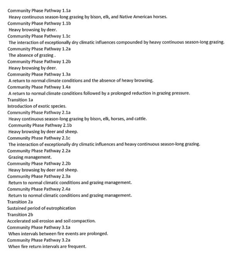 Below is a State and Transition Model diagram to illustrate the “phases” (common plant communities), and “states” (aggregations of those plant communities) that can occur on the site. Differences between phases and states depend primarily upon observations of a range of disturbance histories in areas where this ESD is represented. These situations include grazing gradients to water sources, fence-line contrasts, patches with differing dates of fire, herbicide treatment, tillage, etc. Reference State 1 illustrates the common plant communities that probably existed just prior to European settlement.