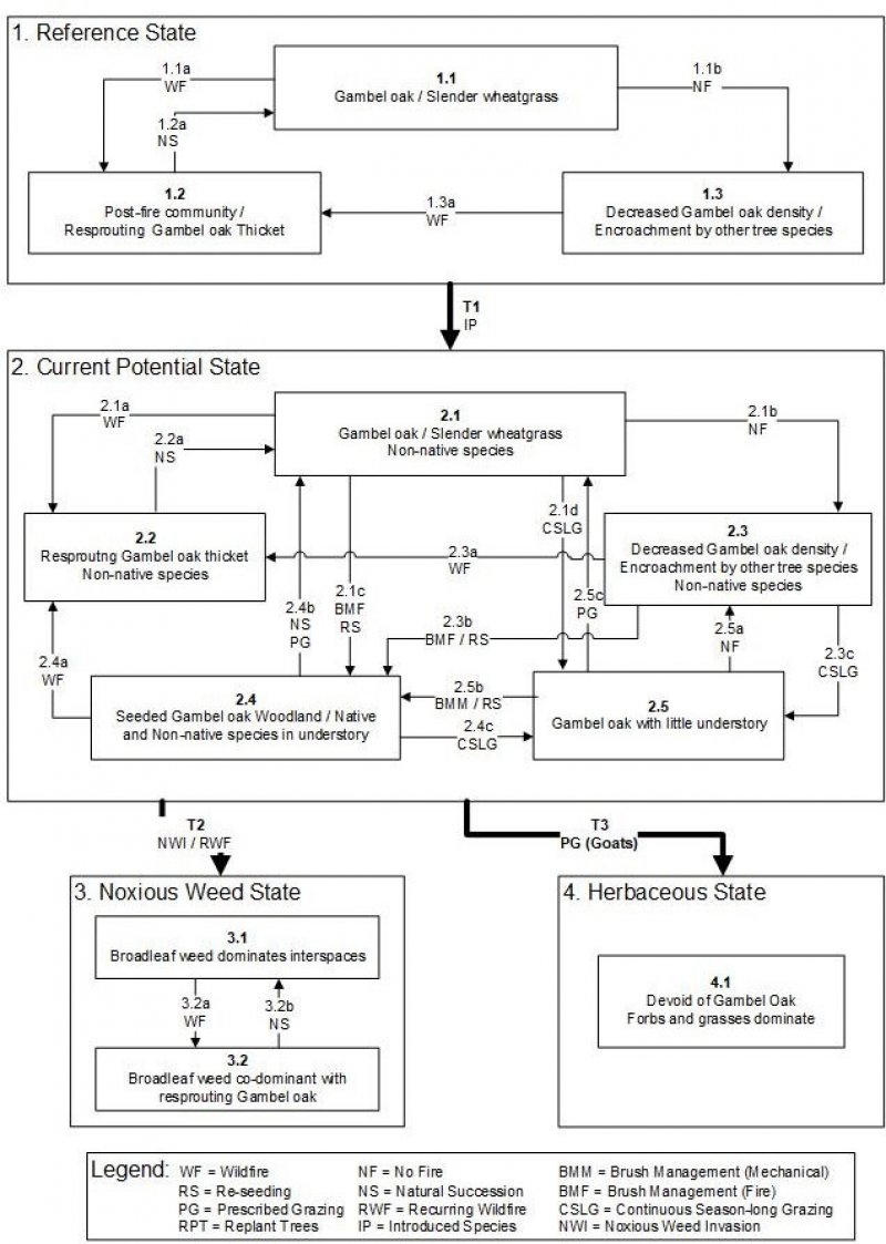 Community Pathway 2.3b Brush Management (Fire) and reseeding – Utilization of techniques such as prescribed fire and range seeding can reduce composition of invading conifers as well as temporarily reduce competition from oak to allow for the herbaceous component to become established.