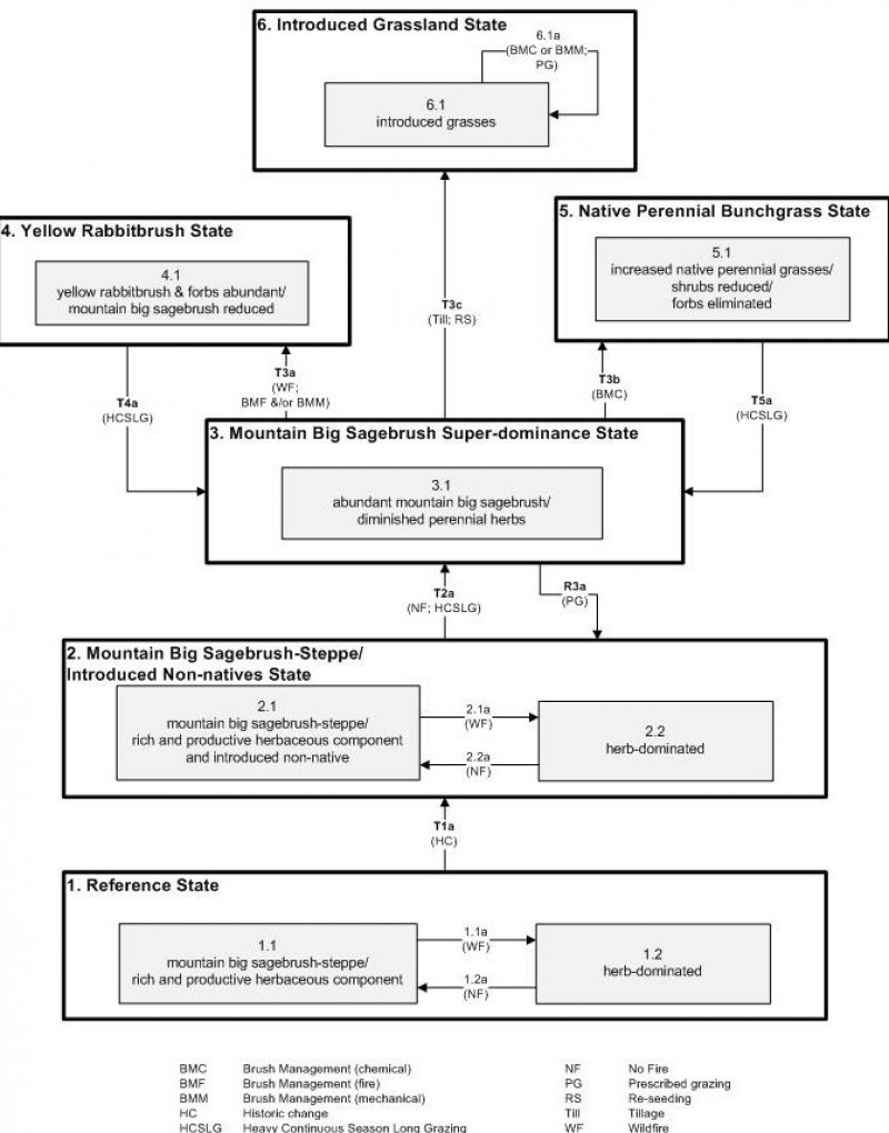 The Reference State is a description of this ecological site just prior to Euro-American settlement but long after the arrival of Native Americans. The description of the Reference State was determined by NRCS Soil Survey Type Site Location information and familiarity with rangeland relict areas where they exist. The least modified plant community would have been co-dominated by mountain big sagebrush (Artemisia tridentata ssp. vaseyana) and a mixture of herbaceous species (1.1). The primary disturbance factor prior to European colonization would have been wildfire (1.1a), which would have removed the sagebrush and allowed the herbs to dominate for a time (1.2) As the time elapsed since the last wildfire grew longer (1.2a), mountain big sagebrush would have increased, and the herbaceous component would have decreased correspondingly. A more complete list of species by lifeform for the Reference State is available in the accompanying tables in the “Plant Community Composition by Weight and Percentage” section of this document.