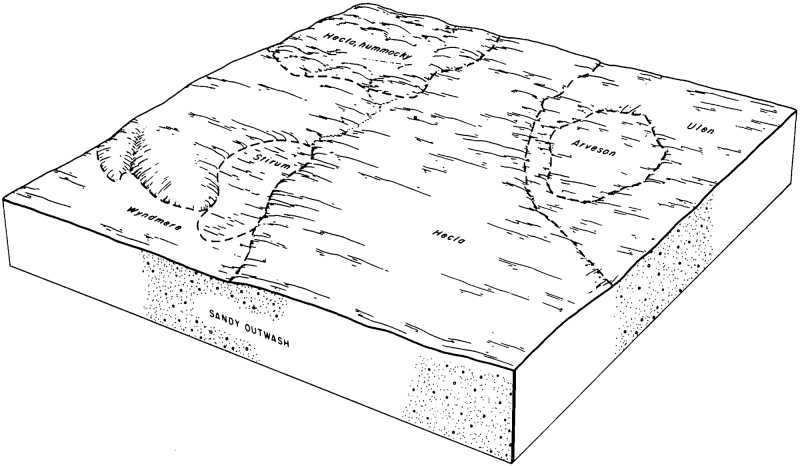 Nearly all of MLRA 55A is covered by till: material that was moved and redeposited by the glaciers. Pre-glaciated bedrock (shale) is exposed in some of the deeper valleys and at the edges of some hills; but what covers the bedrock is glacier sediment, known as drift. These areas have the Late Wisconsin age till plain integrated drainage system in contrast to the closed drainage of the majority of the till plain and moraines. The Drift Prairie Region consists of nearly level to gently rolling glacial till plains dissected by glacial outwash channels. Five rivers flow through parts of the MLRA. The Souris (Mouse) River meanders across the Canadian border through Renville and Ward counties; it then loops east through McHenry County and north through Bottineau County returning to Canada. The Des Lacs River flows southward from Canada through Burke, southwest Renville, and Ward counties where it joins the Souris River. Along the eastern edge of the MLRA the Pembina River, Park River, and Forest River flow eastward to join the Red River. Some soils along these rivers have weathered shale beds in the substratum.