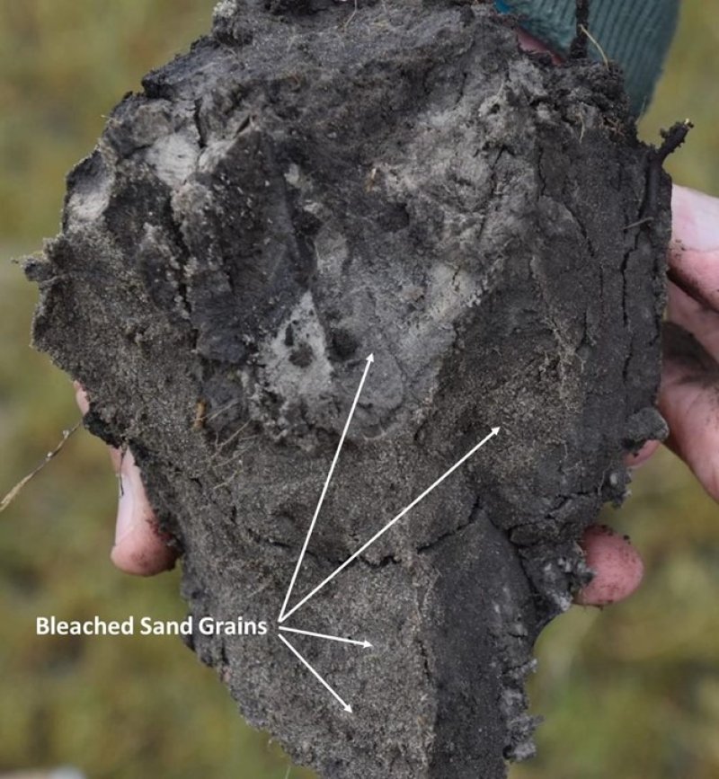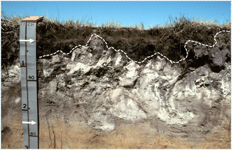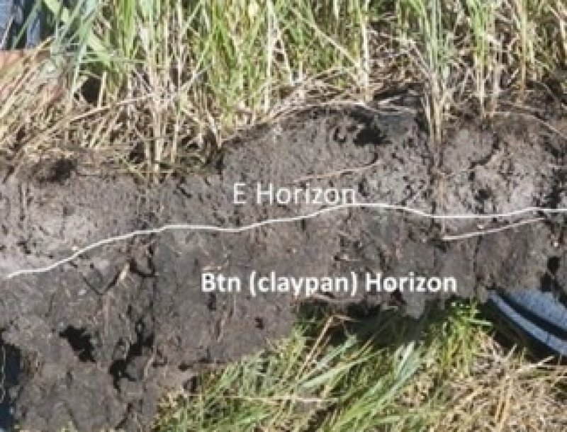 The Sodic Subirrigated ecological site generally is located on flats and shallow depressions on sandy lake plains. The soil parent material is very deep; however, a root-restrictive, dense, sodic claypan subsoil is within a depth of 13 inches. The claypan layer restricts root growth. The soil chemistry influence on the Sodic Subirrigated site is more related to sodicity and alkalinity than to salinity; sodicity and alkalinity have a significant impact on the plant community and vegetative productivity on this site. Commonly, there is a mosaic of vegetation caused by variable depths to the claypan layer (and associated SAR and pH values). Where the claypan layer is within 3 inches of the surface and is highly sodic (SAR is 20 to >40) and very strongly alkaline to very strongly alkaline (pH 8.5 to >9.0), vegetation is extremely sparse and stunted; currently, these areas are identified as the “Thin State” in the State and Transition Model and are included in the Sodic Subirrigated site pending further investigation (see Site Development and Testing Plan). Where the depth to the claypan is greater than 3 inches and the claypan has SAR values less than 13 with pH values less than 9.0, the plant community is more varied with higher biomass production. While salts may be observed in the profile, soil salinity is slight or less (E.C. <8 dS/m) in the primary rooting zone (0 to 20 inches). The soils in this site are poorly drained with redoximorphic features within a depth of 18 inches. The soil forms a ribbon <2 inches long. Slopes range from 0 to 1 percent. This site can also be closely intermingled with associated ecological sites. On the landscape, this site is below the Limy Subirrigated and Sandy Claypan ecological sites and above the Shallow Marsh sites. The Saline Lowland and Wet Meadow ecological sites occur on similar landscape positions as the Sodic Subirrigated site. Wet Meadow sites do not have a claypan layer. Saline Lowland sites have moderate or strong salinity (E.C. >8) within a depth of 16 inches.