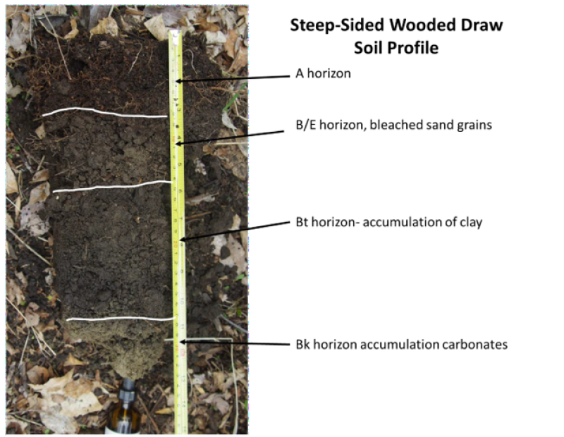 The Steep-Sided Wooded Draw ecological site occurs on moderately steep to very steep sideslopes of ridges (draws), as well as on slumps (rotational slides) and hillslopes in badlands and associated sedimentary uplands. The site typically has north or east aspect. Soils data suggests this site shifted temporally and spatially (via fire and drought) between sparsely wooded with herbaceous understory to closed canopy deciduous forest. Deciduous trees and shrubs are established in these areas; however, periods of herbaceous plants increased on the site following fire. Soils on this site are well drained and deep or very deep. Typically, a thin O horizon (<3 inches thick) overlays the mineral soil. The A horizon has a loam, silt loam, or clay loam texture. Immediately below the A horizon is a non-calcareous subsoil layer (Bw or Bt horizon); this horizon forms a ribbon 1 to 2 inches long. A layer of carbonate accumulation (Bk or Btk horizon) is commonly within a depth of 24 inches. On the landscape, the Steep-Sided Wooded Draw site is below the Badland, Shallow Loamy, and Very Shallow ecological sites. Limy Residual and Loamy sites are on similar or lower landscape positions. Claypan, Loamy Overflow, and Flat Bottom Wooded Draw sites are below the Steep-Sided Wooded Draw sites. Slopes range from 9 to 70 percent.
