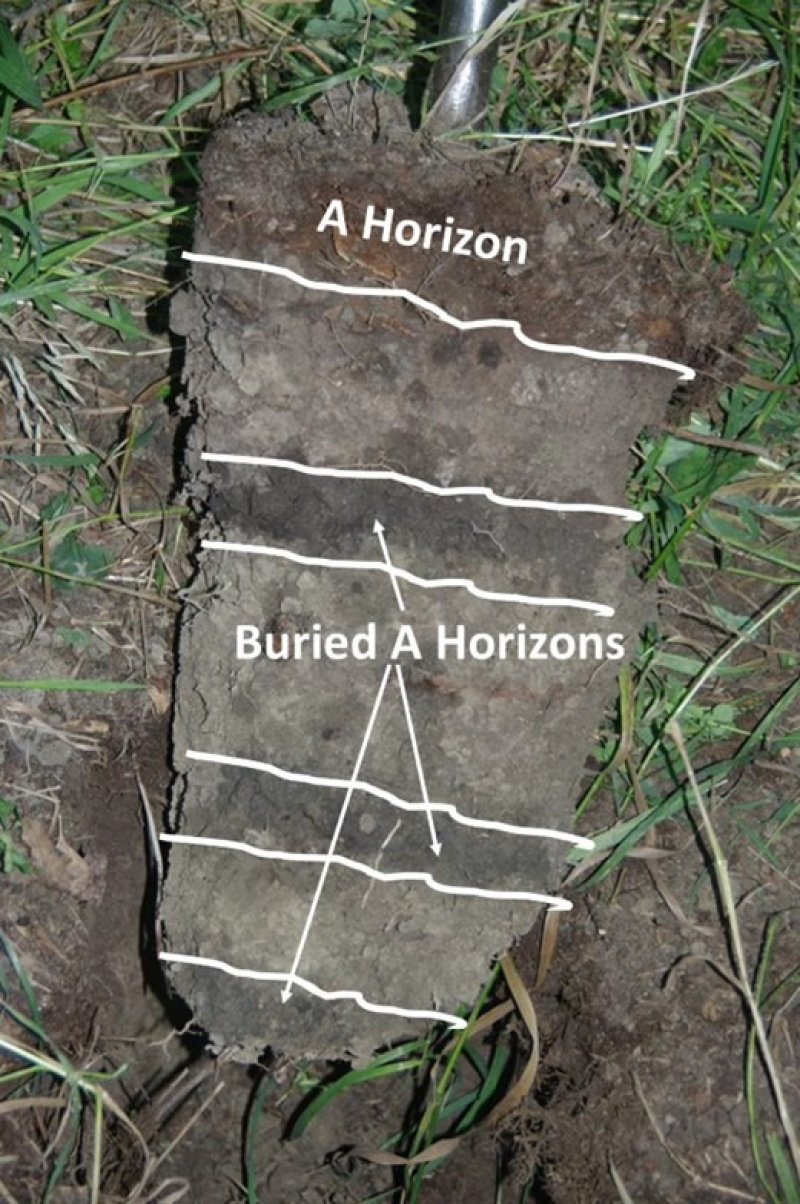 Figure 7. Flat Bottom Wooded Draw Soil Profile with buried A horizons due to numerous sedimentation events.