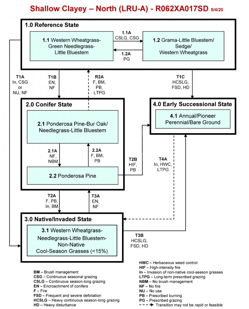 The vegetation in the Reference State (1.0) consists of a mix of cool- and warm-season grasses, cool-season rhizomatous wheatgrass, needlegrasses, and warm-season bunchgrasses will be the dominant groups. Forbs are common and diverse. Shrubs will include rose, skunkbush sumac, and silver sagebrush. Ponderosa pine and bur oak may be found scattered across the site.