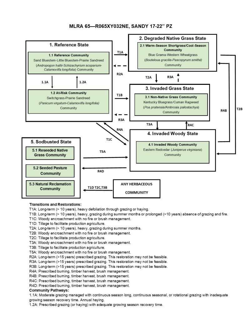The historic native vegetation of the Sandy 17-22" PZ ecological site is Sandhills Prairie. Vegetation in the Reference Plant Community (1.1) consists of a mixture of warm-season tall- and midgrasses and cool-season grasses. Dominant grasses include sand bluestem, prairie sandreed, switchgrass, little bluestem, and needle and thread. The plant community includes a diverse population of forbs and shrubs. In the absence of periodic fire, the Sandy 17-22" PZ ecological site is susceptible to invasion by woody species, especially eastern redcedar.