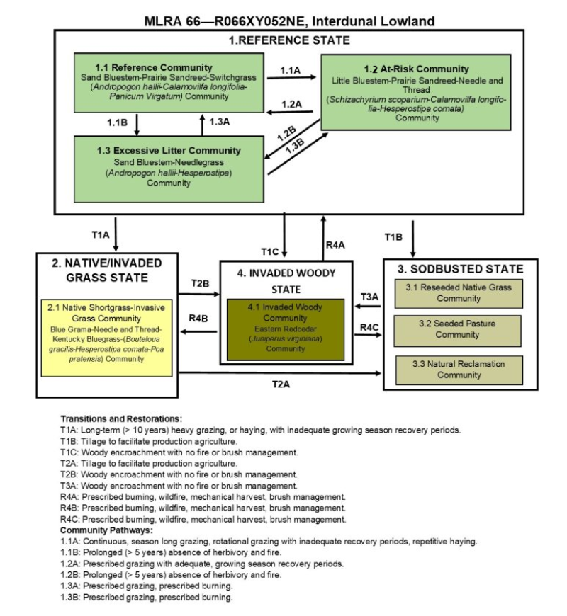 The State-and-Transition Model (STM) is depicted below and includes a Reference State (1), a Native/Invaded Grass State (2), a Sodbusted State (3), and an Invaded Woody State (4). Each state represents the crossing of a major ecological threshold due to alteration of the functional dynamic properties of the ecosystem. The main properties observed to determine this change are the soil and vegetative communities and the hydrologic cycle. Each state may have one or more vegetative communities that fluctuate in species composition and abundance within the normal parameters of the state. Within each state, communities may degrade or recover in response to natural and man-caused disturbances such as variation in the degree and timing of herbivory, presence or absence of fire, and climatic and local fluctuations in the precipitation regime. The processes that cause the movement between the states and communities are discussed in more detail in the state and community descriptions following the diagram.