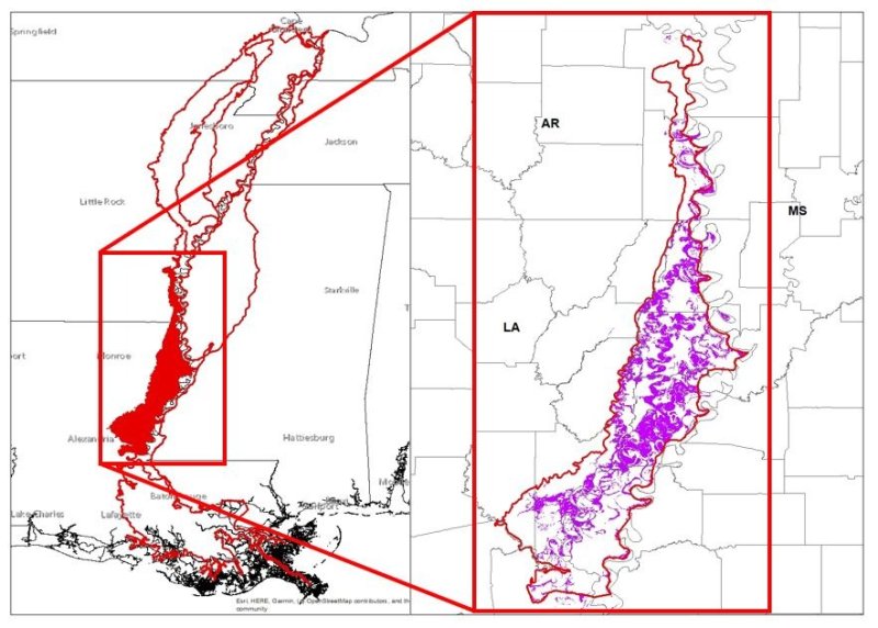 EPA Level IV Ecoregion (portions of 73a - Northern Holocene Meander Belts, 73d - Northern Backswamps, 73i - Arkansas/Ouachita River Backswamps, 73m - Southern Backswamps and 73K Southern Holocene Meander Belts, of the Southern Mississippi River Alluvium Major Land Resource Area.)