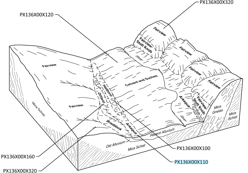 Precambrian and Paleozoic metamorphic and igneous rocks underlie almost all of this MLRA. The dominant metamorphic rock types include gneiss, schist, slate, argillite, and phyllite, among others. Dominant igneous rock types include granite and other related felsic crystalline rocks. Mafic intrusive rocks, including gabbro, diabase, amphibolite, and other dark colored rocks, underlie a minority of the upland landscape. These mafic intrusions crop out in the form of dikes and sills, and often weather to produce soils high in base cations.