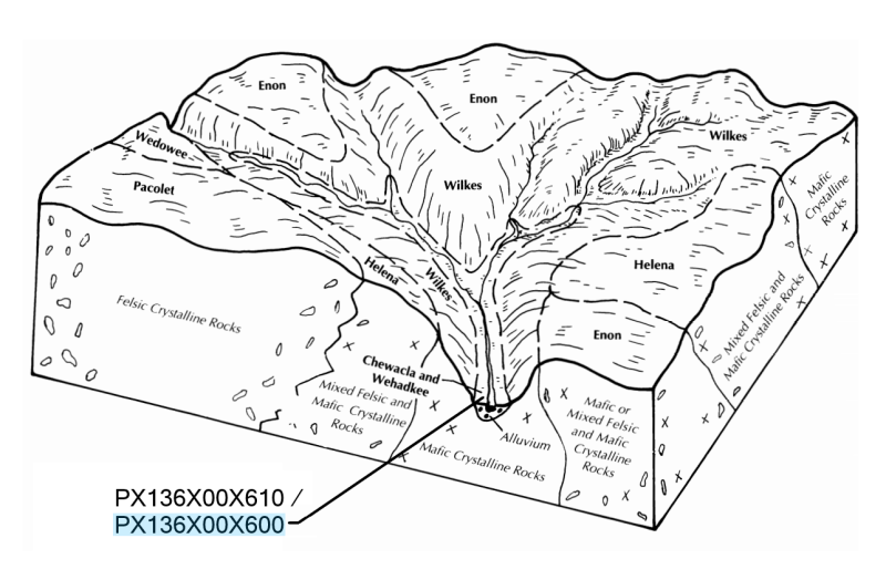 Precambrian and Paleozoic metamorphic and igneous rocks underlie almost all of this MLRA. The dominant metamorphic rock types include gneiss, schist, slate, argillite, and phyllite, among others. Dominant igneous rock types include granite and other related felsic crystalline rocks. Mafic intrusive rocks, including gabbro, diabase, amphibolite, and other dark colored rocks, underlie a minority of the upland landscape. These mafic intrusions crop out in the form of dikes and sills, and often weather to produce soils high in base cations.