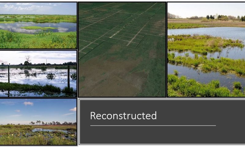 To reconstruct from a Drained Pastureland to a Reconstructed Slough and Glades Marsh state, the natural water flow and hydroperiod of the area needs to be restored. All water control and drainages infrastructure need to be removed. Landscape modification will be needed to mimic or simulate the original geomorphic positions to establish the correct hydroperiod durations of the Slough and Glades Marsh States. Replanting native vegetation may be needed.
