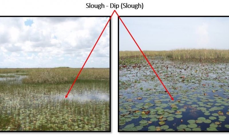 The water in these dips\sloughs is slow moving, and sloughs may dry completely during droughts. In South Florida, some of these areas have formed from the burning of underlying sapric organic soil materials layers in strand swamps and glades marsh during droughts. These sloughs\dips also known as depressions then fill with water when the site is once again flooded causing longer hydroperiods (6 to 11 months) allowing water emergent vegetation communities to be established. As such, these can be shifting communities, with old sloughs eventually filling in with peat while new ones are created by peat fires which cannot be mapped and are part of the system. Coastal plain willow is a common colonizer when fires have consumed soils in the Everglades Ecoregion. Alligators further create heterogeneity in sloughs by wallowing and digging in the peat substrate, excavating “gator holes” which will elongate the hydroperiods (6 to 11 months) and resulting in the creation of refuge for wildlife during droughts. Under drought conditions, wildfires may burn down the peat layer, destroying sawgrass roots and converting these areas to lower elevation creating longer hydroperiods (6 to 11 months) allowing emergent communities or to deeper water (sloughs\dips). Topographic variation may result not only from severe fires, but also from highs and lows in the underlying limestone bedrock, or from the formation of sapric organic materials tree islands, or batteries . These batteries are most common in the northeastern Everglades where solid masses of peat become dislodged from the floor of the marsh and drift to a new location, eventually reattaching to the bottom. The topographic high created by the sapric organic materials formation may become colonized with woody vegetation, especially swamp bay (Persea palustris), and can ultimately become a tree island (F156AY210FL), while the hole left behind will become a much deeper allowing water emergent communities vegetation (slough\dips).