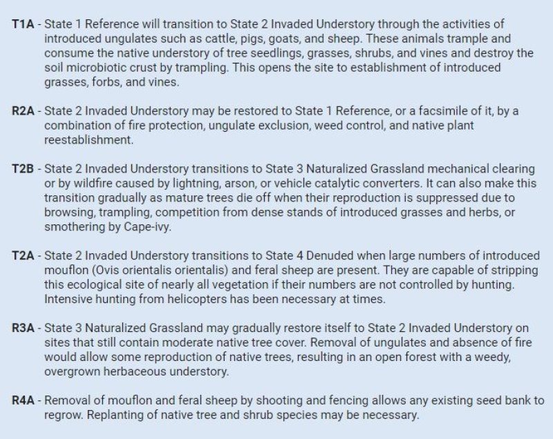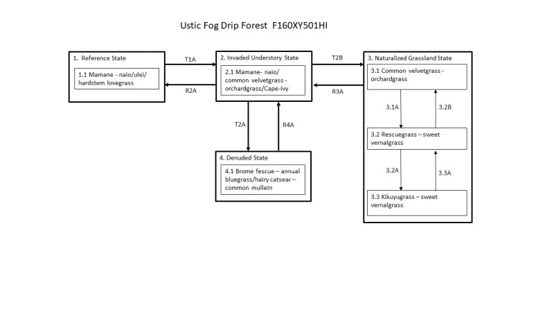 The central concept of the Ustic Fog Drip Forest is of well drained, deep Andisols formed in deposits of volcanic ash ranging from 11,000 to 300,000 years old. Soil textures are ashy or medial sandy loams or loamy sands, and many soils have high rock contents and/or vitric (volcanic glass) mineralogy, resulting in fairly low water holding capacity. Annual air temperatures and rainfall are associated with cool (isomesic), seasonally dry (ustic) soil conditions where this site occurs between 4,500 and 8,250 feet in elevation. While average rainfall is fairly low (20 to 40 inches), frequent and persistent cloud cover at ground level in most of the area adds significant amounts of moisture to the soil by fog drip captured by tree canopies. Trees tend to grow in clumps interspersed with open areas vegetated by grasses and shrubs. Overstory trees are short to medium in stature (16 to 40 feet; 5 to 12 meters). Common overstory species are mamane (Sophora chrysophylla), naio (Myoporum sandwicense), sandalwood (Santalum paniculatum), akoko (Chamaesyce olowaluana), and mountain pilo (Coprosma montana).