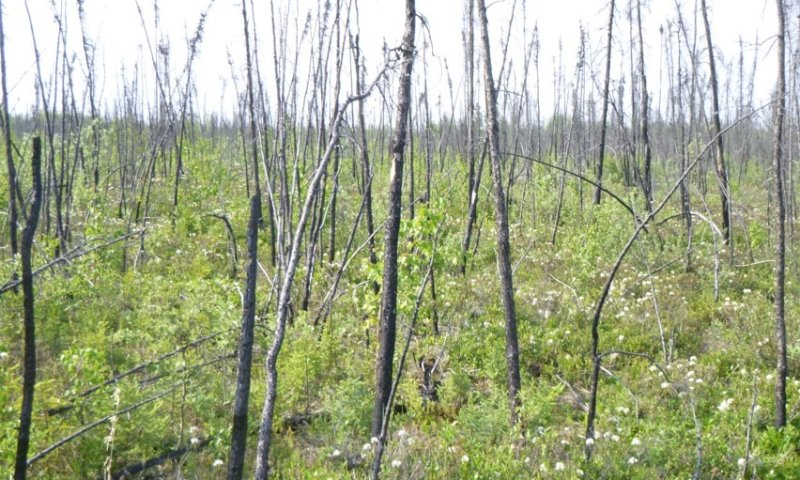 Much of the soil in this area supports forested communities in some stage of post-fire recovery. Mesic to dry soils in the uplands support mixed forests of black spruce, white spruce, paper birch, and quaking aspen. White spruce and white spruce-balsam poplar forests occur on occasionally to rarely flooded portions of the floodplain-step. Black spruce woodlands occur on stream terraces and other places with wet soils and/or shallow permafrost. On permafrost-affected alluvial flats, tamarack occurs in association with black spruce. Lightning-caused wildfires are common. Many thousands of acres are often burned during a single fire. Following wildfires, willow, shrub birch, and ericaceous shrub scrub invade most previously forested ecological sites until they eventually are replaced by forest vegetation. After fire, resin birch is common on wet and mesic soils and quaking aspen on dry soils. On all forest and woodland ecological sites, post-fire succession leads to a relatively rapid accumulation of organic matter and mosses on the surface. This accumulation results in decreases in soil temperature, biologic activity, and nutrient availability and a gradual decrease in site productivity.