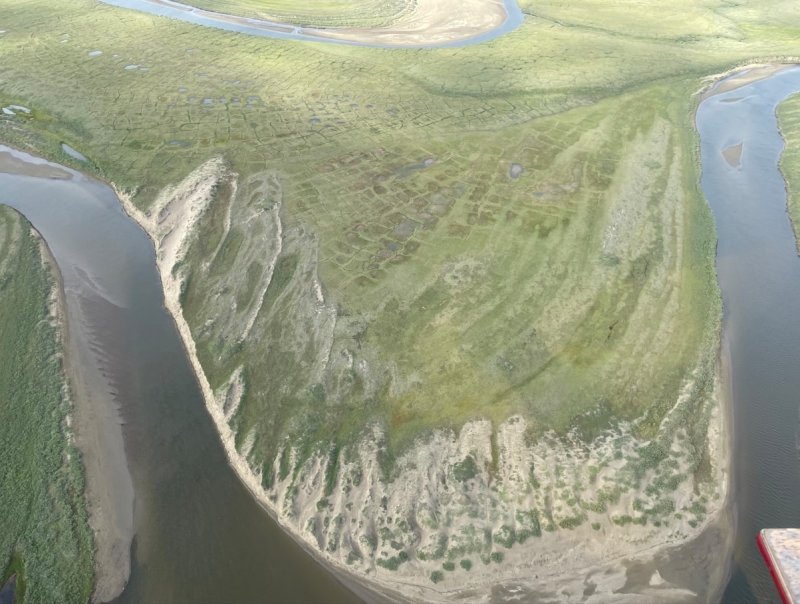 Figure 1. Photo of floodplain, active and stabilized dunes, younger stream terraces, and older stream terraces adjacent to Judy Creek in the National Petroleum Reserve.